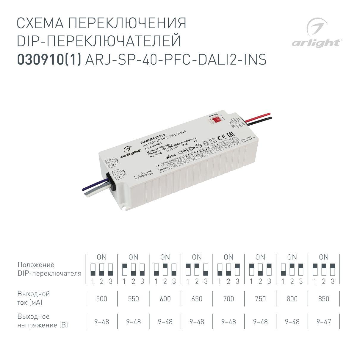Драйвер Arlight ARJ-SP-40-PFC-Dali2-INS 9-48V 40W IP20 0,5-0,85A 030910(1)