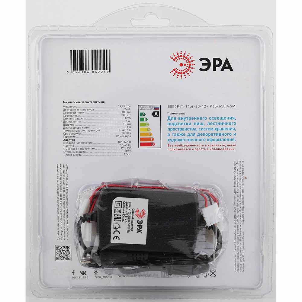 Светодиодная влагозащищенная лента ЭРА 14,4W/m 60LED/m 5050SMD холодный белый 5M 5050kit-14,4-60-12-IP65-6500-5m Б0043068