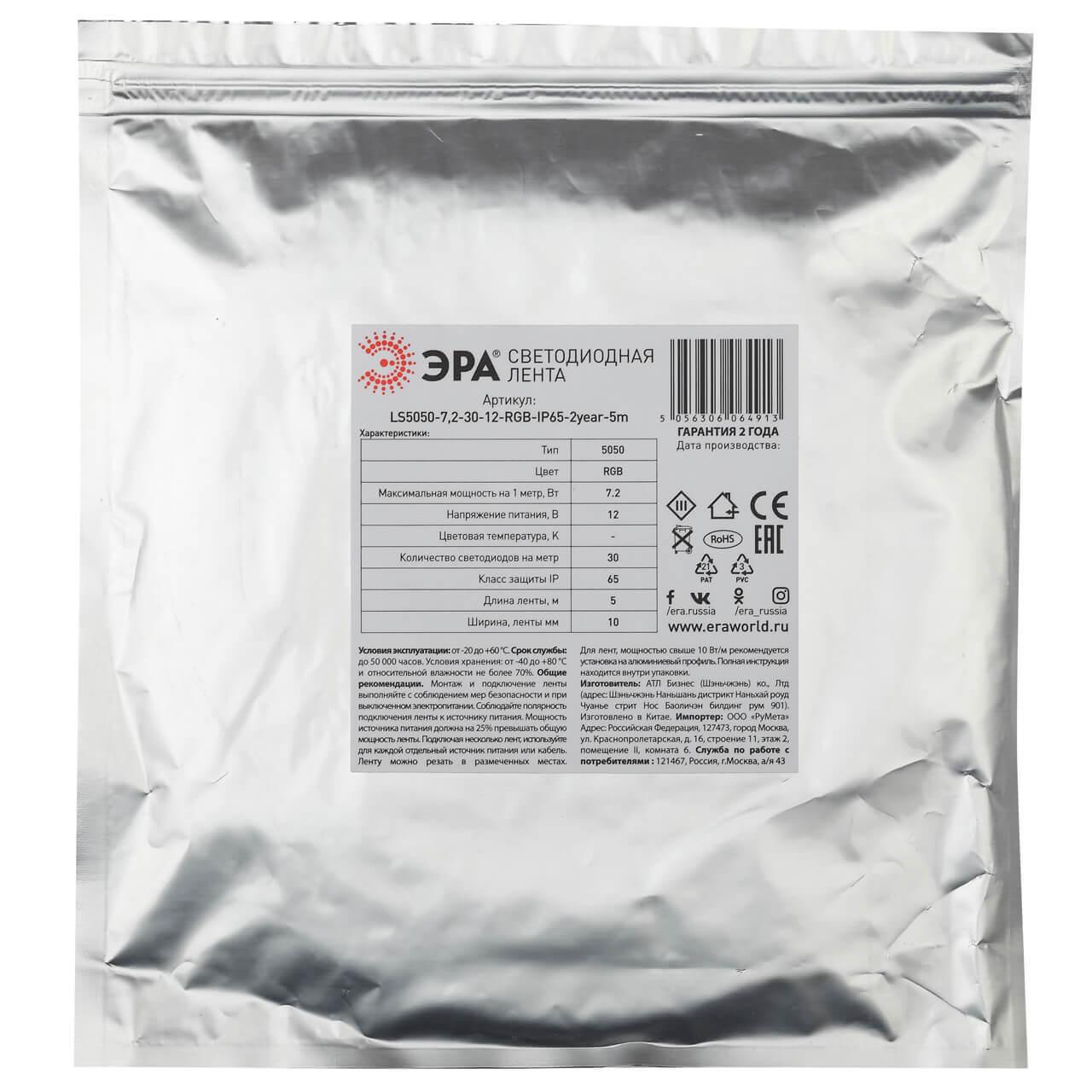Светодиодная влагозащищенная лента ЭРА 7,2W/m 30LED/m 5050SMD RGB 5M KU-5050AD-30D-RGB Б0044121