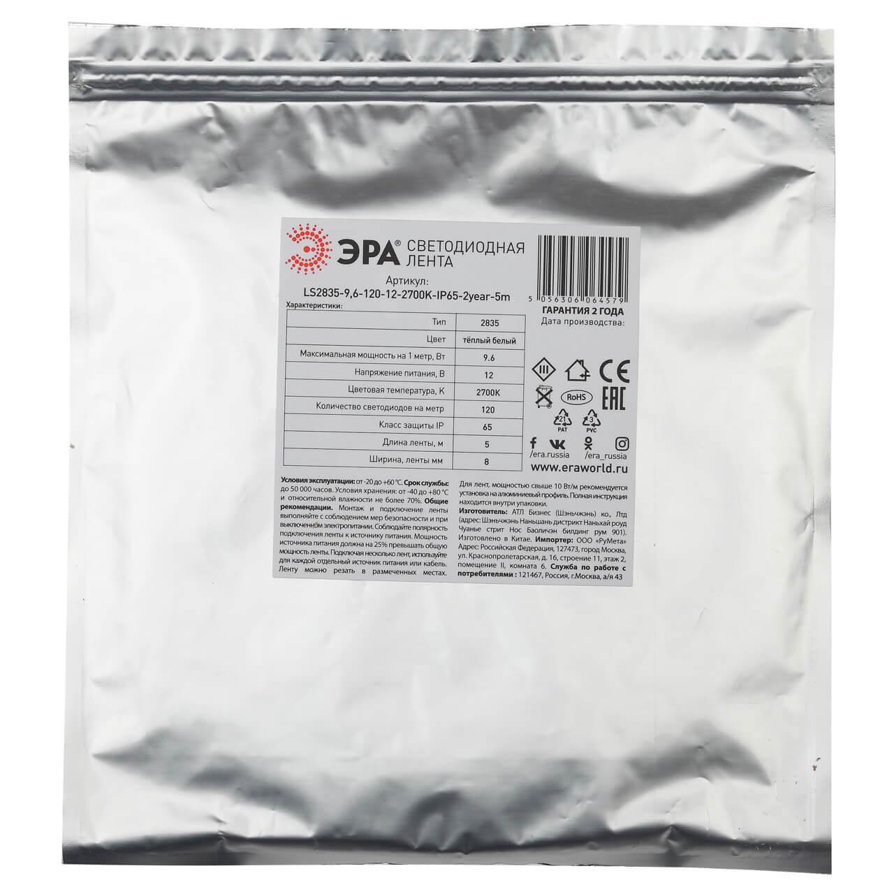 Светодиодная влагозащищенная лента ЭРА 9,6W/m 120LED/m 2835SMD холодный белый 5M KU-2835AD-120D-W Б0044115